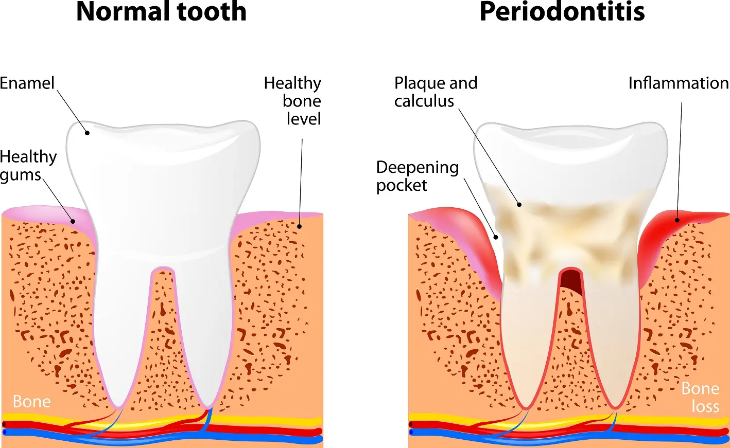 Periodontal diseases are most commonly caused by the presence and proliferation of specific microorganisms.[5] The presence of plaque, containing these groups of microorganisms, elicits an immune response and the production of inflammatory cytokines as well as reactive oxygen species (ROS). The resulting inflammation leads to damage of the supporting tissues.[5] This can manifest as receding gum lines and the actual loss of teeth. Therefore, the risk of developing these conditions increases when oral hygiene is neglected and plaque remains around teeth and the gum line.[5]