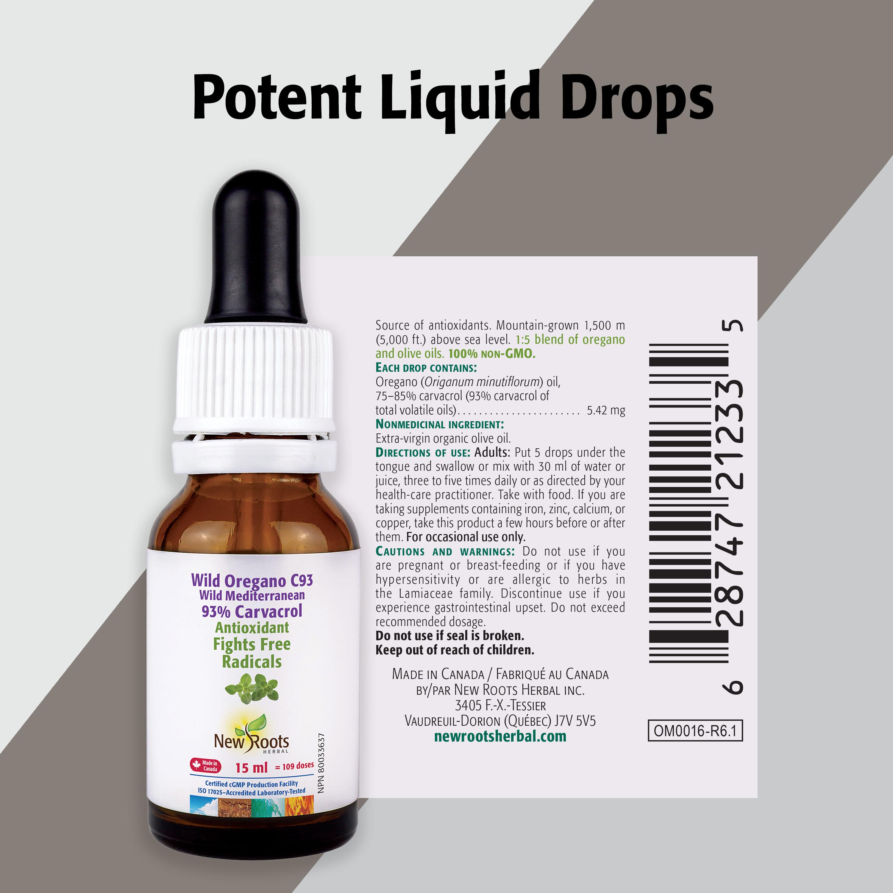Wild Oregano C93 delivers the essence of wild Mediterranean oregano in its purest form. Hand-picked Origanum minutiflorum is steam-distilled and blended with organic olive oil for a 1:5 ratio, providing 93% carvacrol within its total volatile oilsâa potent source of antioxidants that help support the bodyâs natural defences.
